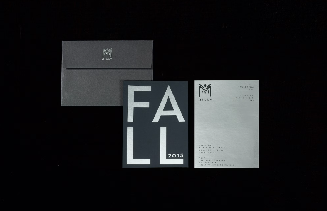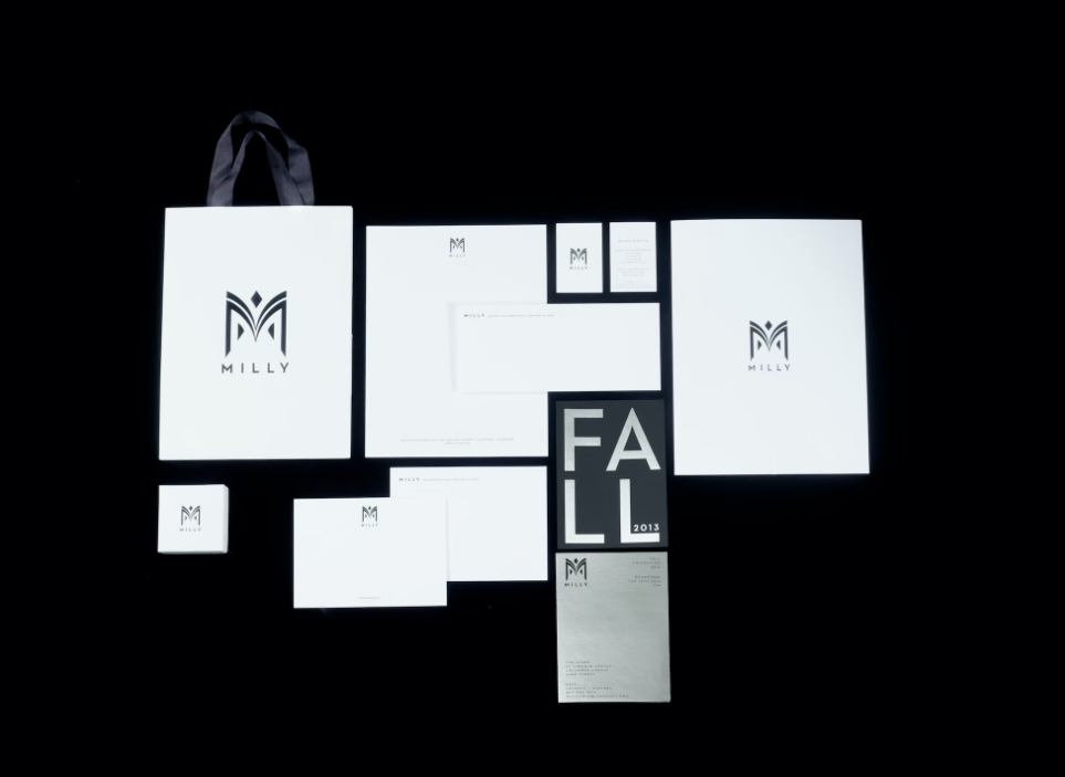 MILLY品牌成立于 2001 年,之前的 Milly 标志是复古的,几乎夸张的女性化,出现在脚本字体和粉红色和金色的调色板中。身份是有限的,不再体现系列的 DNA。