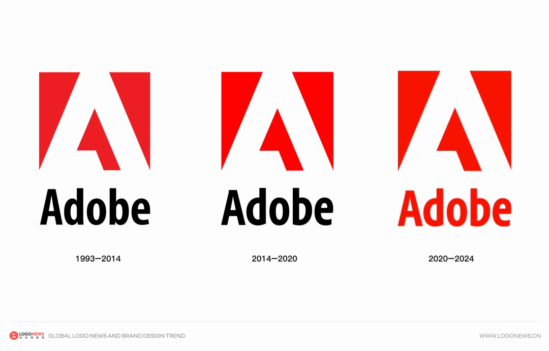 1993年,Adobe迎来了第二阶段的标志大变化。这次重新设计首次引入红、白、黑三色搭配,但最引人注目的还是那个红色方形背景中的白色「A」字图标。显而易见,这一设计灵感延续自初代标志的三角形「开放」形式,然后在搭配上黑色的「Adobe」字样,使其显得更加现代化和醒目。虽然三十多年来有几次微调和改进,但红色的图标可以说是Adobe使用时间最长的识别符号了。