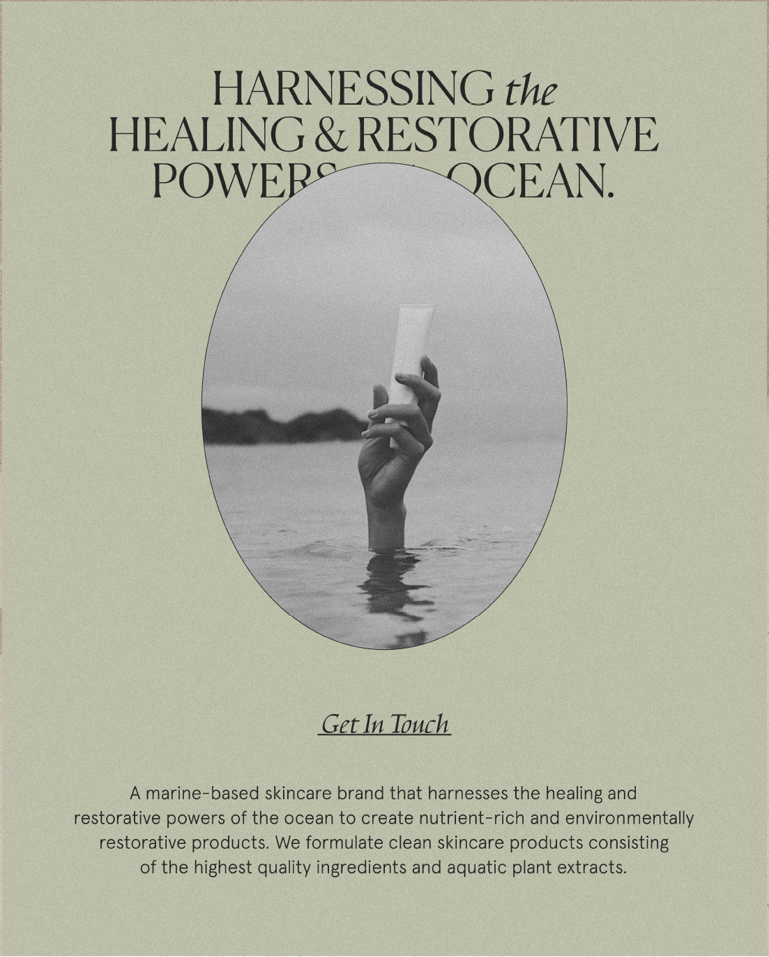 我们专注于品牌推广体验,使目标受众在寻找对人体和地球无害的清洁营养养分的护肤品时,焕发青春,滋养并与海洋联系在一起,从而使他们拥有最佳的外观和感觉。–具有自觉,现代,简约,清洁和豪华感的身份。