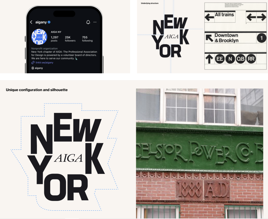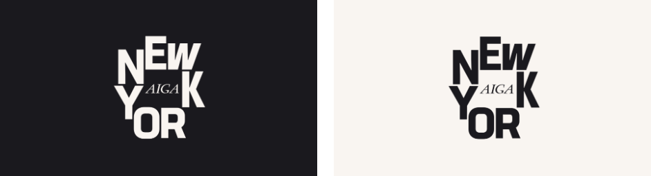 标识的核心是一个定制化的字母组合系统:字母围绕原有的AIGA方框排列,通过负空间巧妙构建出一个象征“城市广场”的图形区域。这种近乎建筑式的构图语言,既呼应纽约网格化的城市肌理,又传递出开放、包容的社区属性。